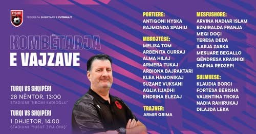 Shqipëria e vajzave do të zhvillojë dy ndeshje miqësore kundër Turqisë më 28 nëntor dhe 1 dhjetor. Skuadra e drejtuar nga trajneri Armir Grima do të nisë grumbullimin dhe përgatitjet të hënën në Tiranë, për t’u zhvendosur më pas në Stamboll, ku do të vijojë fazën përgatitore.