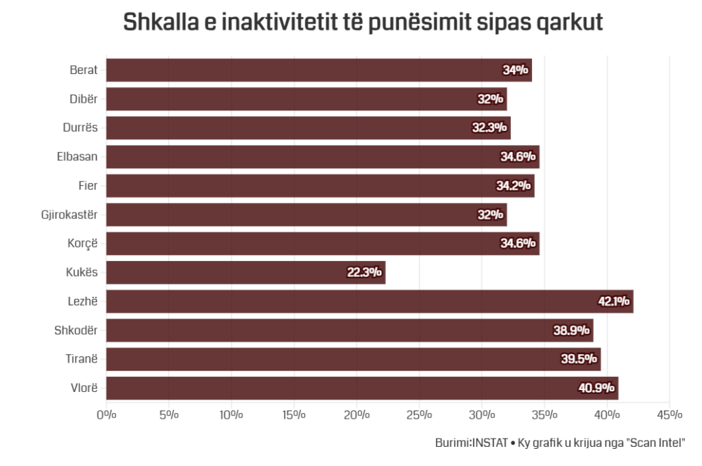 Të dhënat e Instiutit të Statistikave sipas shkallës së inaktiviteti të punësimit tregojnë qartë se vendi përballet ende me sfida të theksuara në aktivizimin e popullsisë në moshë pune, ndërsa zonat periferike dhe bregdetare shfaqin prirje të ndryshme.