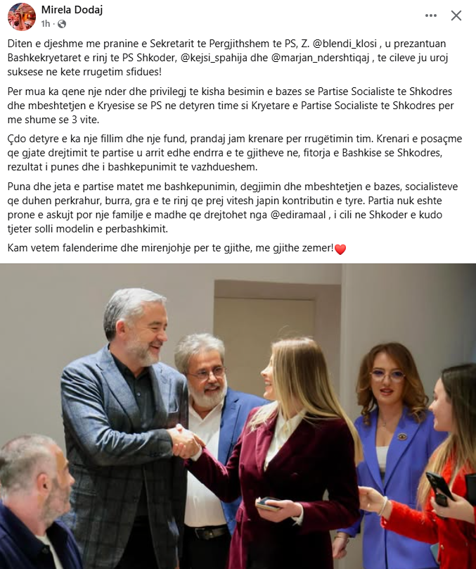 Pas prezantimit te drejtuesve te rinj, Mirela Dodaj, ish kryetare e PS ne Shkoder ka shkruar nje status falenderimi ku mes rreshtave uron Ndershtiqajn dhe Spahine teksa thote se partia nuk eshte prone e askujt…