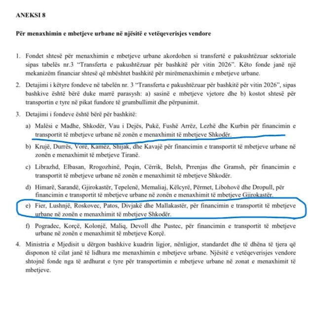 Sipas Aneksit 8 të projektbuxhetit 2026, ndarja e fondeve është bërë në bazë të sasisë vjetore të mbetjeve që prodhojnë njësitë vendore dhe kostove shtesë të transportit drejt pikave fundore të grumbullimit dhe përpunimit.