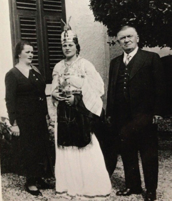 Fig. 5 – Stefani Curani me prindërit e saj Stefë dhe Marija (Steiner) Curani me kostum kombëtar dhe përkrenaren e Skënderbeut.