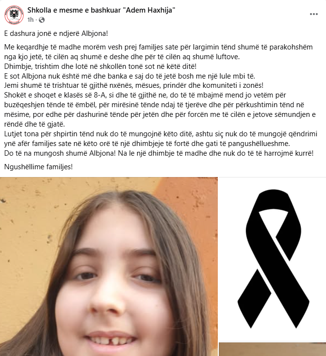 “E sot Albjona nuk është më dhe banka e saj do të jetë bosh me një lule mbi të… Do të na mungosh shumë, Albjona! Na le një dhimbje të madhe dhe nuk do të të harrojmë kurrë!” – thuhet në mesazhin e shkollës.
